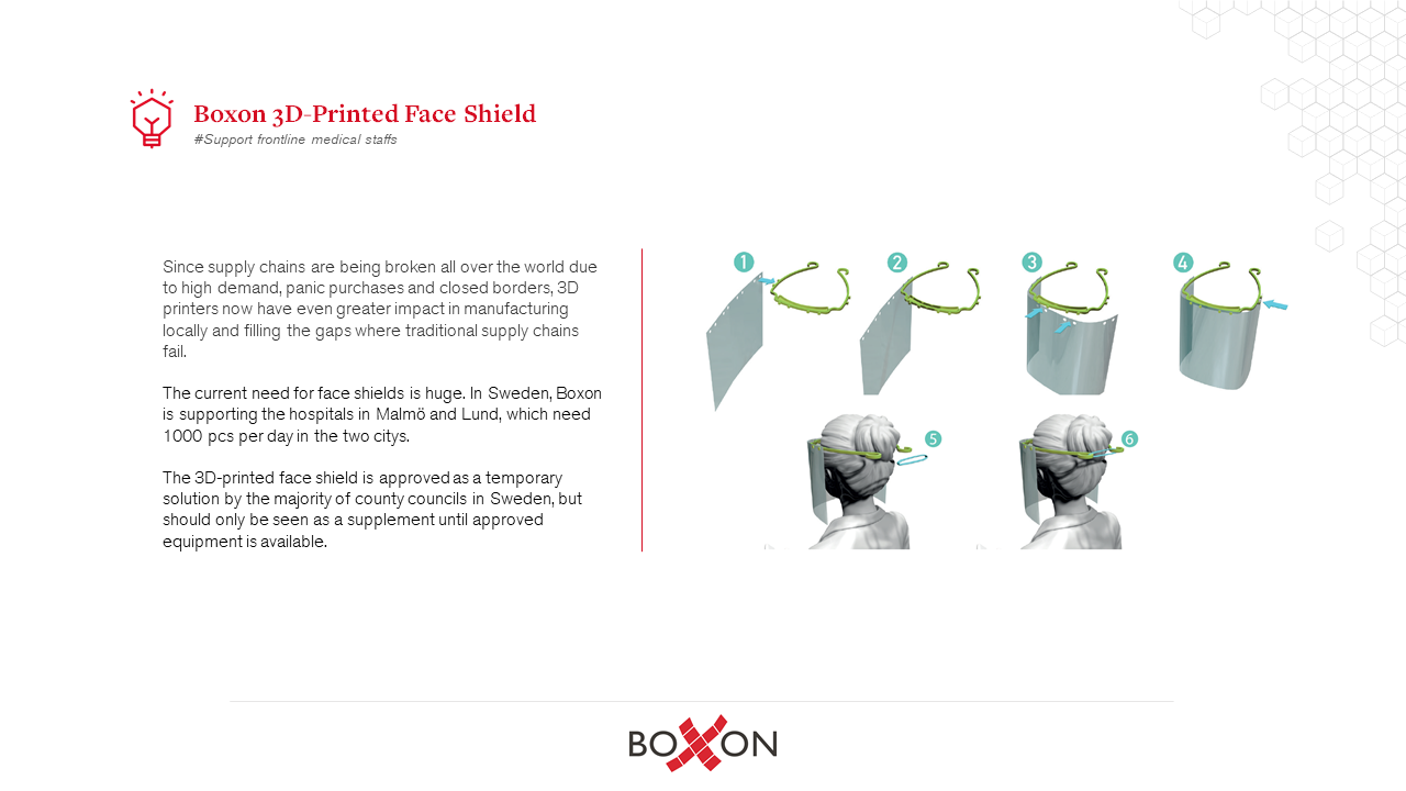 In Sweden, numerous individuals and companies around the country are volunteered to join and donate the 3D-printed parts. If you have access to a 3D printer and would like to help, everything you need to help make more masks can be found here: https://3dverkstan.se/protective-visor/